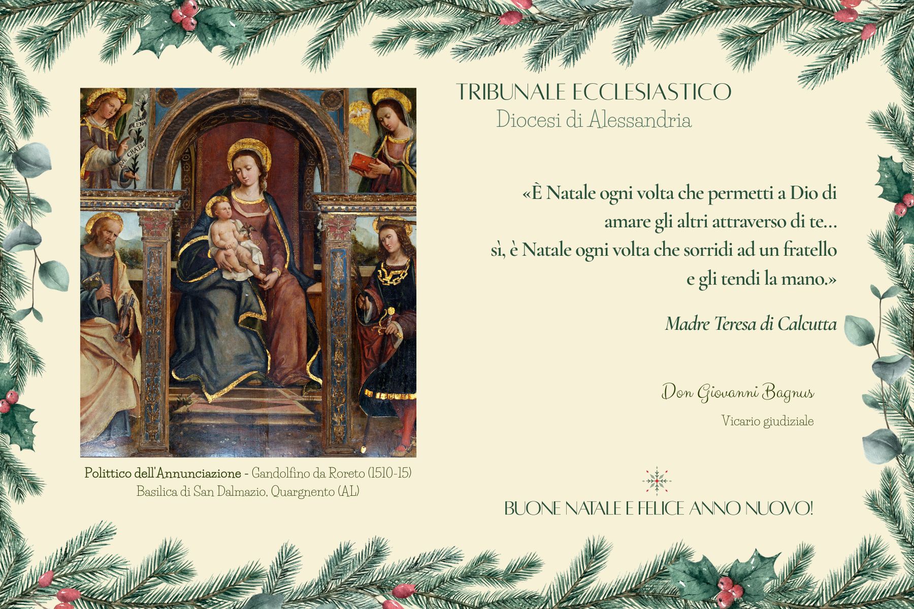 Il Vicario Giudiziale del Tribunale Ecclesiastico della Diocesi di Alessandria, don Giovanni Bagnus, insieme alla Cancelleria e a tutti i membri del Tribunale, augura un sereno Natale e un felice anno.